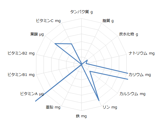| タンパク質 g | 脂質 g | 炭水化物 g | ナトリウム mg | カリウム mg | カルシウム mg | リン mg | 鉄 mg | 亜鉛 mg | ビタミンA μg | ビタミンB1 mg | ビタミンB2 mg | 葉酸 μg | ビタミンC mg | |